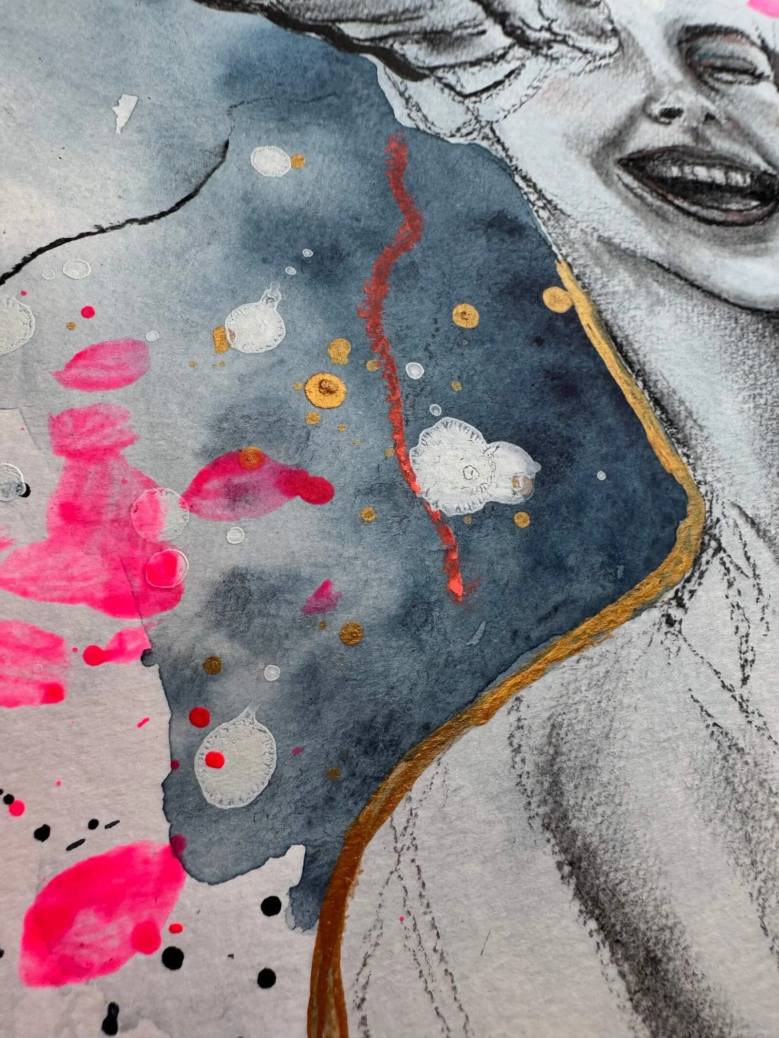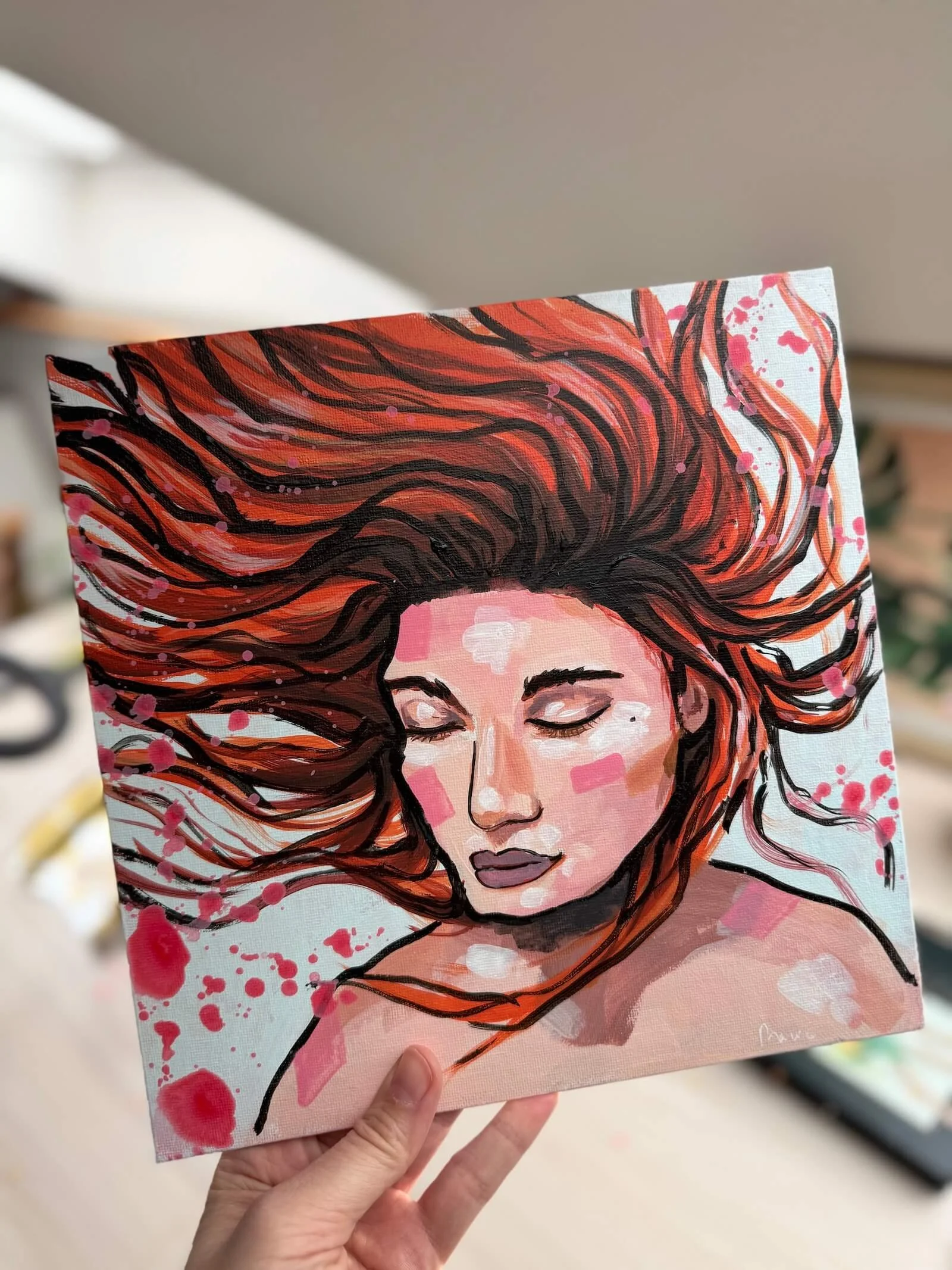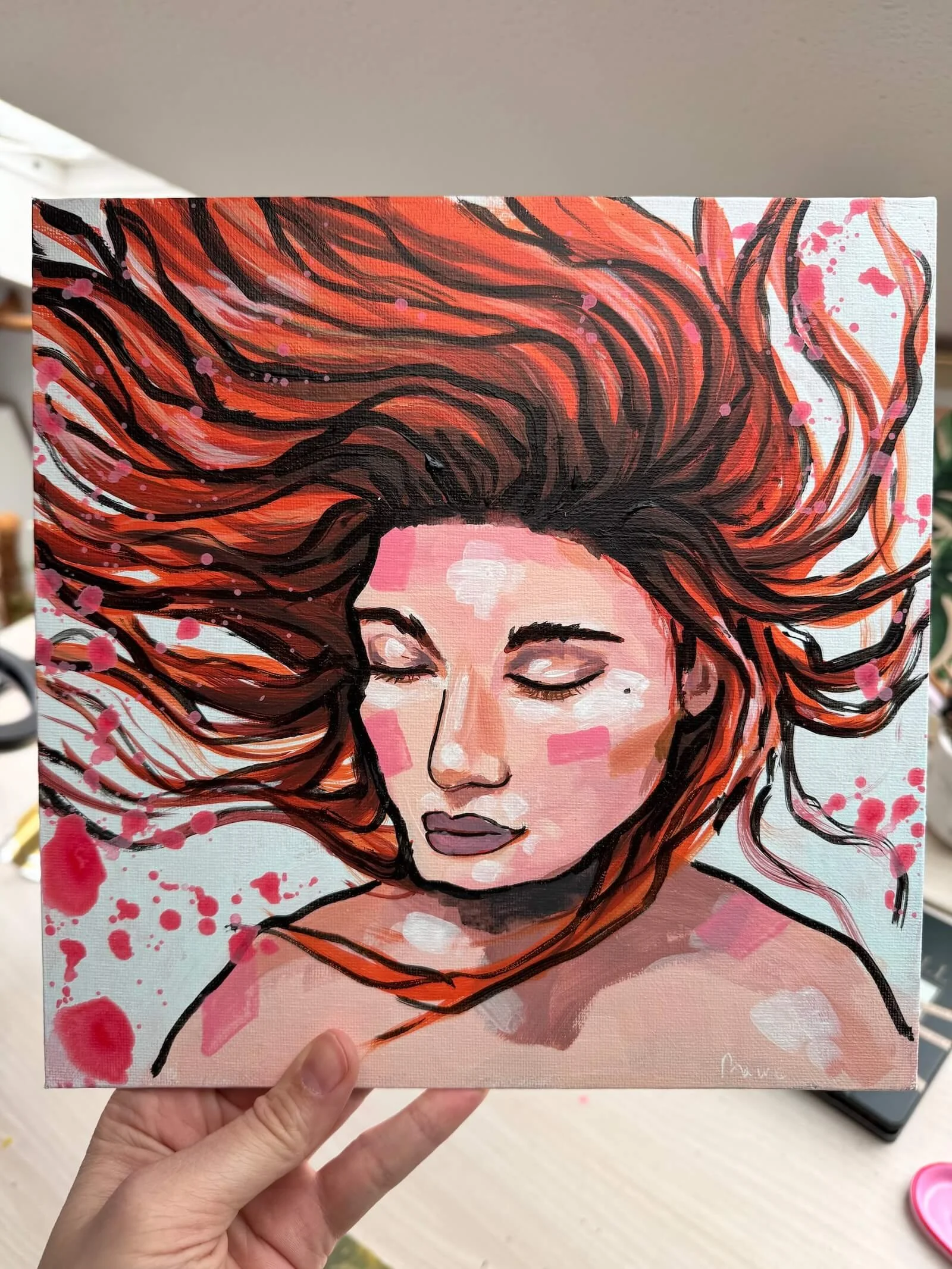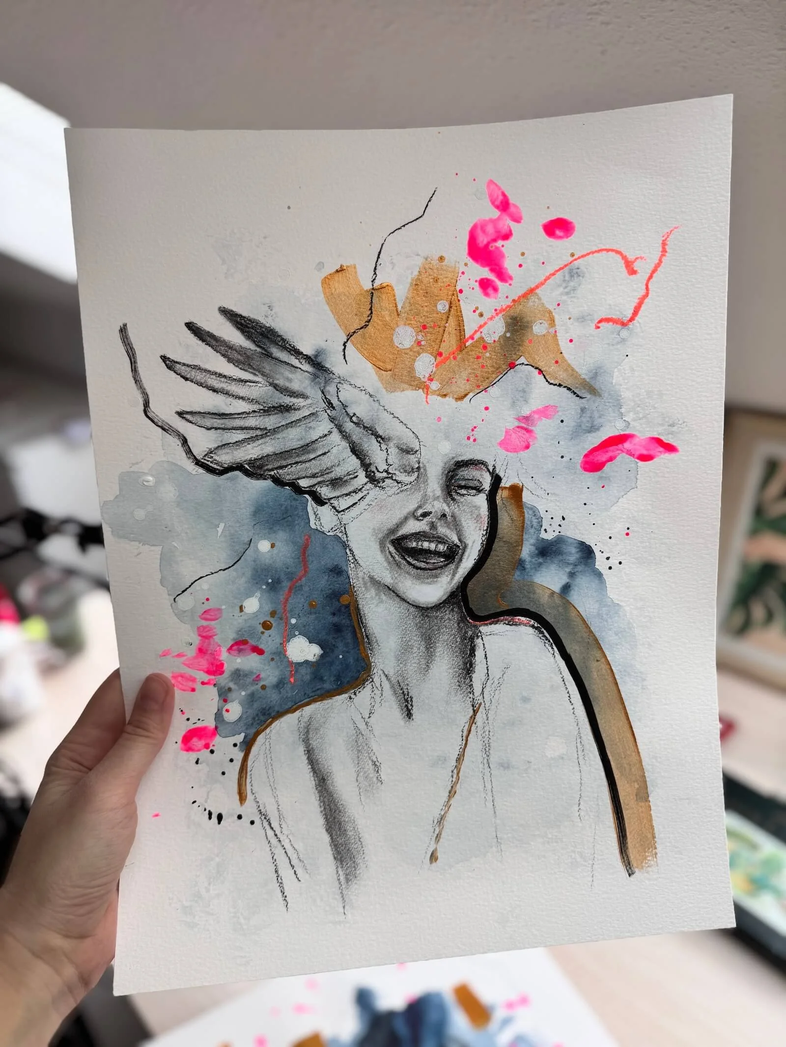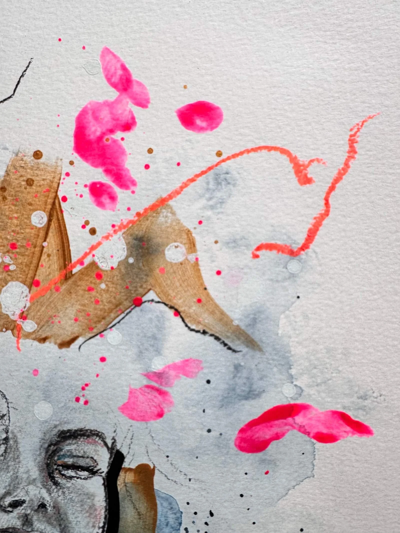 Dieses Werk entstand in einer Zeit, in der vieles stürmisch war. Die dargestellte Figur ruht mit geschlossenen Augen – nicht, um sich zu verstecken, sondern um dorthin zu blicken, wo Hoffnung sanfter spricht und dennoch deutlicher zu hören ist. Die Farben fließen ineinander wie Gefühle ohne feste Ränder: sanftes Blau, warmes Rosa, Gelb und Orange, die sich gegenseitig tragen.